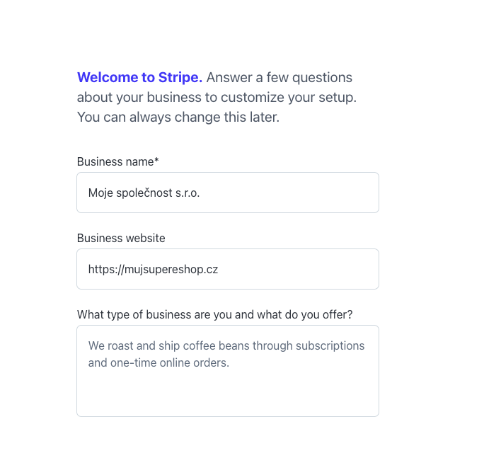 Po vytvoření účtu musíme vyplnit pár základních informací o našem podnikání.